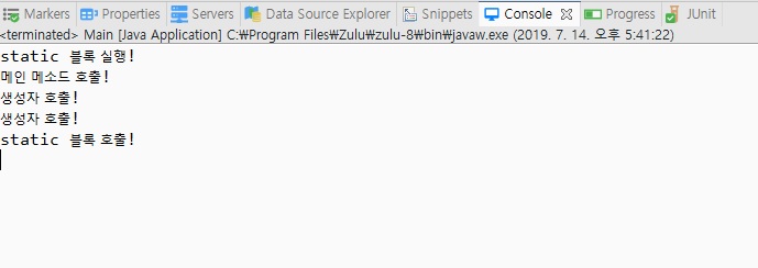 1 2 3 4 5 6 7 8 9 10 11 12 13 14 15 16 17 18 19 20 21 | public class Main { static String info; static { System.out.println("static 블록 실행!"); info = "static 블록 호출!"; } public Main() { System.out.println("생성자 호출!"); } public static void main(String[] args) { System.out.println("메인 메소드 호출!"); Main m1 = new Main(); Main m2 = new Main(); System.out.println(Main.info); } } | cs |